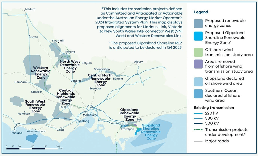- Transmission Network upgrades – To deliver this new energy to consumers, the VTP outlines seven priority transmission upgrade programs needed between now and 2040. This includes reinforcing existing lines and building at least four new high-voltage transmission projects to connect the REZs. Notably, major upgrades in western Victoria (to support wind and solar from the Grampians and South-West REZs by approximately 2028) and eastern Victoria (to strengthen supply from the Gippsland REZ and metropolitan Melbourne demand by 2028–29) are scheduled. A new South-West 500 kV line is proposed by 2033 to unlock wind in that region, and an expanded “loop” transmission system in Gippsland will be required in the 2030s to connect successive offshore wind projects. These projects, alongside already announced transmission links like VNI West (Victoria NSW Interconnector West) and the Western Renewables Link, are considered essential to meet Victoria’s renewable targets and replace retiring coal capacity.